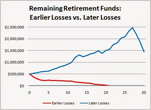 You’ll see that even with the exact same annualized returns, one account becomes completely depleted after 21 years, while the other one is still going strong.