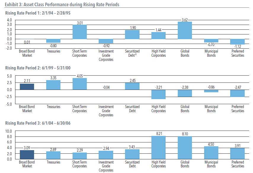As you can see, in all three periods, the Broad Bond Market fared all right and delivered positive returns (though the ’94/’95 period was a squeaker). Even though narrower segments within the bond market fared poorly, other areas made up for it with positive returns.