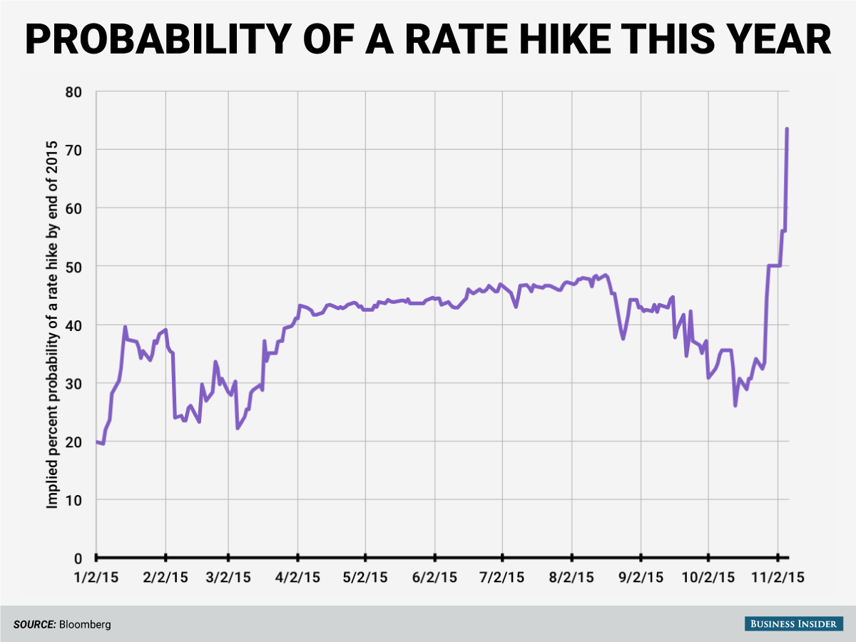 Last week’s stronger-than-expected jobs report blew apart the expectation that the Federal Reserve would stay on the sidelines until next year to raise interest rates. Here’s a graph of the market’s expectations: