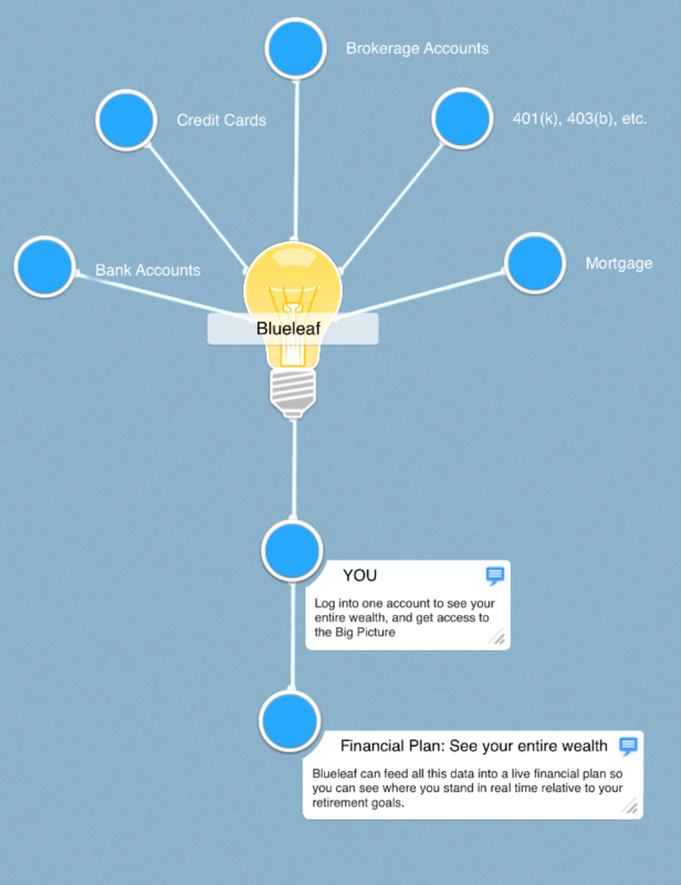 Blueleaf is the system I found that does all that. 401(k)’s, 403(b)’s, Scottrade, Schwab, Ameritrade, Fidelity, mortgage, bank accounts – everything – is captured in one place for clients to see. And most importantly, it’s secure. It uses bank level encryption, and the person who programmed the security has a Ph.D in cryptography from Harvard and the head engineer was the Chief of Internet Operations at the Pentagon for 6 years. Client information is safe.