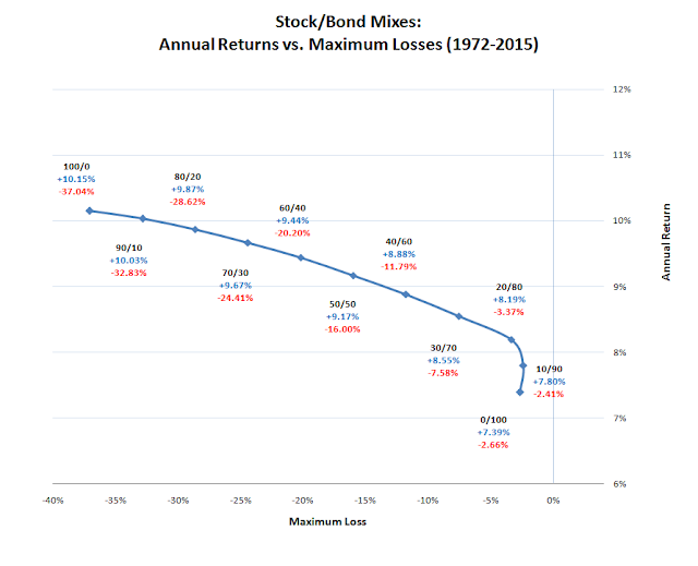 With stocks at all time highs and bond yields near all time lows because of high perceived risk, I’ve never seen this kind of configuration in the markets before, so this time, it may indeed be different, but the historian in me always fears the outcome whenever it has been perceived to be different and valuations haven’t mattered. It’s when valuations matter least that it matters most to have some method of protecting your investment portfolios from loss, which is why we remain invested, but with more conservative asset allocations. We are happy to give up a little return in order to gain a lot from reduced downside, as this graph below shows: