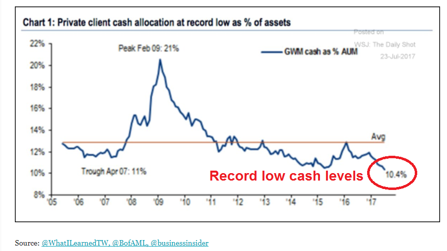 In addition, cash levels are at record lows, and as cash levels are contrarian indicators (high levels are bullish because it signals pessimism and weak hands have sold, while low levels are bearish because no ammo is left to drive markets higher), it’s signaling that greater caution should be exercised at these levels: