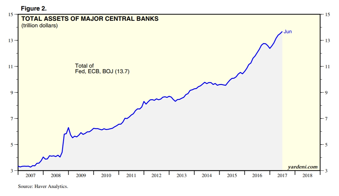 3) Or it could be something completely different that is infrequently accounted for. Take, for example, the behavior of central banks around the world. Ever since the Financial Crisis, central banks have been buying bonds in a quest to drive interest rates lower in order to spur more borrowing, and by extension, higher spending on capital investments to increase the rate of economic growth. While the Federal Reserve has stopped expanding their balance sheet and is in the beginning stages of shrinking it, the two other sources of bond buying are still at it full speed. Here’s a look at the combined balance sheets of the major Central Banks around the world (Federal Reserve, European Central Bank, Bank of Japan):