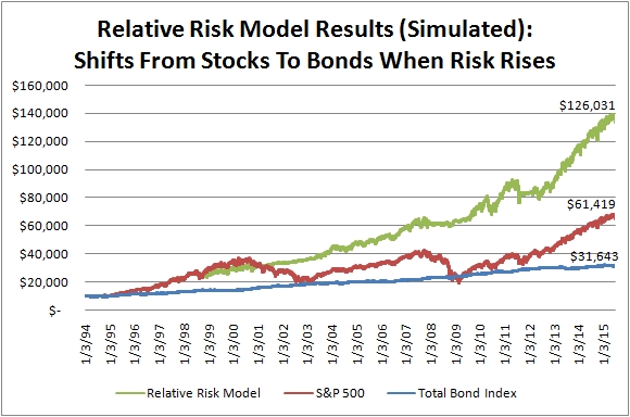 To demonstrate how such an approach has fared in the past, the following are simulated results of $10,000 invested in our Relative Risk Model, from January 1994 to September 30, 2015. The model allocates between stocks and bonds, depending on the changing risks of each asset class: